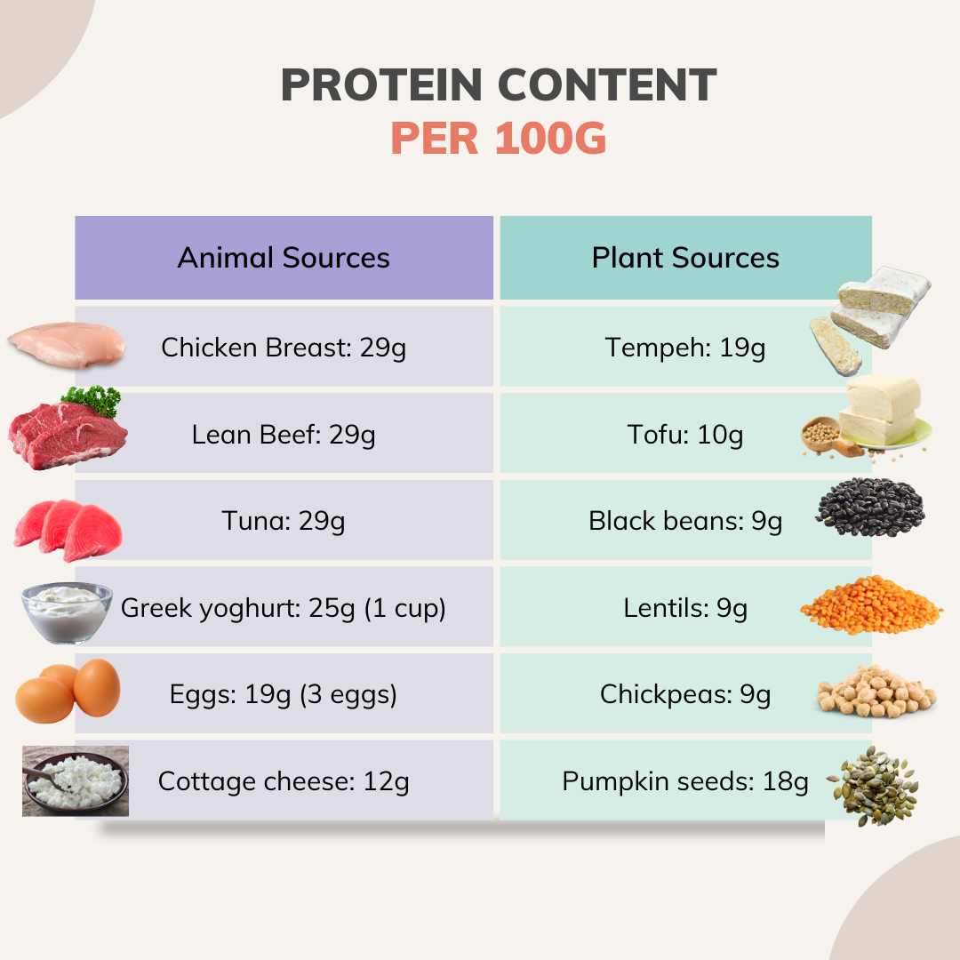 Consider the foods in the image. These are all 100g servings, but as you can see, some contain much higher quantities of protein. You don’t need to only focus on eating the most protein-dense foods, just be aware that when using the foods with lower quantities as your protein sources, you’re going to need larger servings to get the same amount of protein! Aiming to consume a balanced intake from multiple of these sources will help you to cover all your essential amino acids.